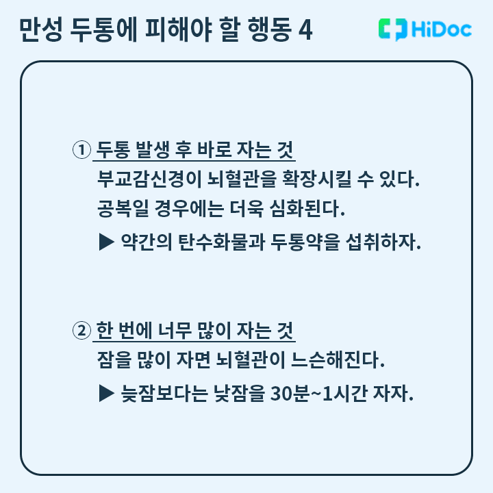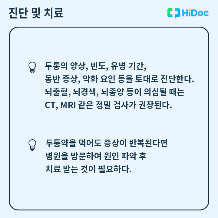 만약 한 달에 절반가량 두통이 3개월 이상 지속되고 구토나 발한과 같은 증상이 나타나면 병원을 방문해 두통의 원인을 파악하고 치료해야 한다. 무작정 두통약을 먹으면 오히려 증상이 심해질 수 있어 주의가 필요하다.