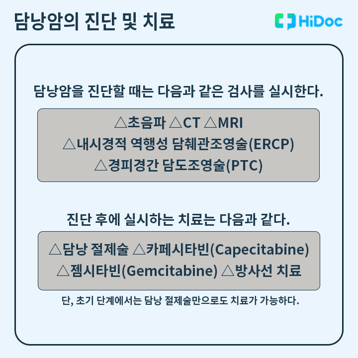 진단 시에는 초음파, CT, MRI 등의 검사가 사용되며, 진단 후에는 담낭 절제술, 항암화학요법, 방사선 치료 등 다양한 방법을 시도할 수 있다.