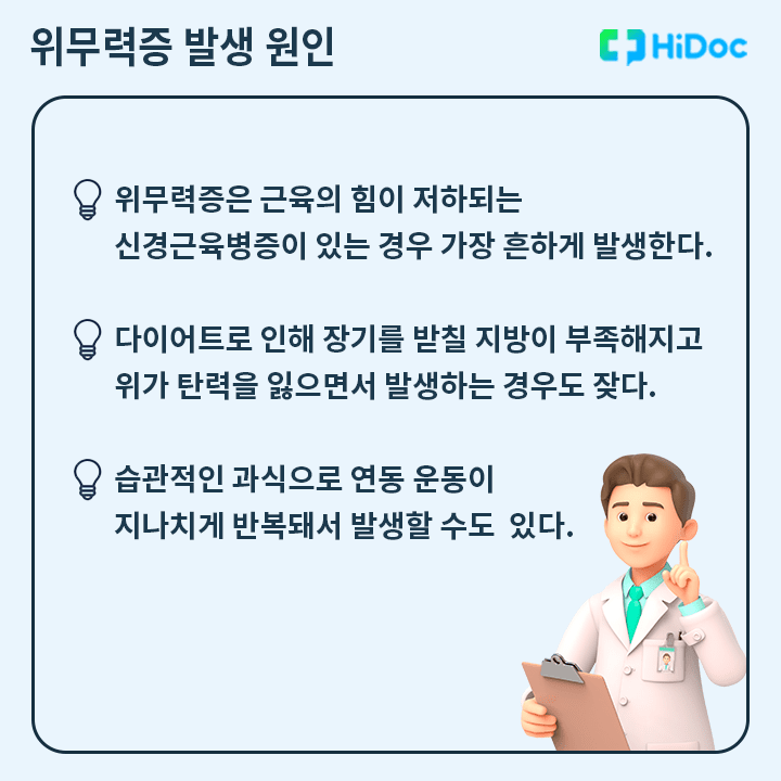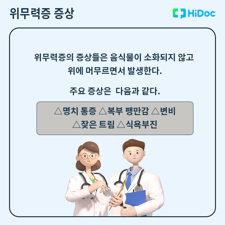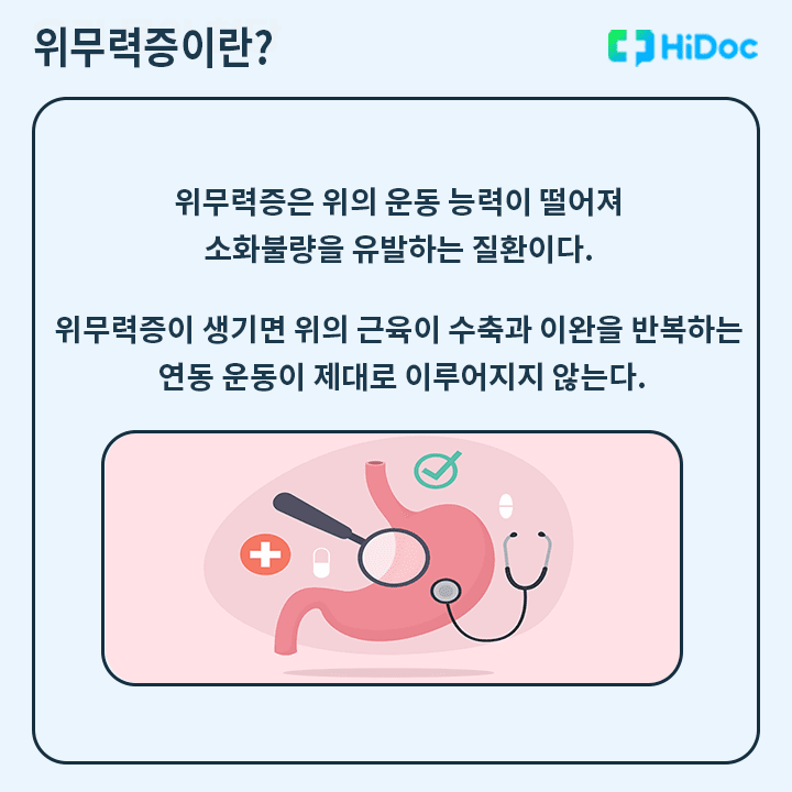 위무력증은 위 근육의 수축과 이완을 반복하는 연동 운동이 제대로 이뤄지지 않는 질환이다. 위무력증이 발생하면 소화불량과 함께 △명치 통증 △복부 팽만감 △변비 △잦은 트림 △식욕부진과 같은 증상이 나타난다.