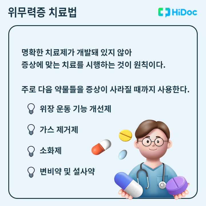 아직 명확한 치료법이 발견되지 않아 소화제, 가스 제거제, 위장 운동 기능 개선제 등의 약물을 증상이 사라질 때까지 사용하며 스스로 건강을 관리하는 것이 최선이다.