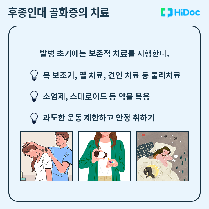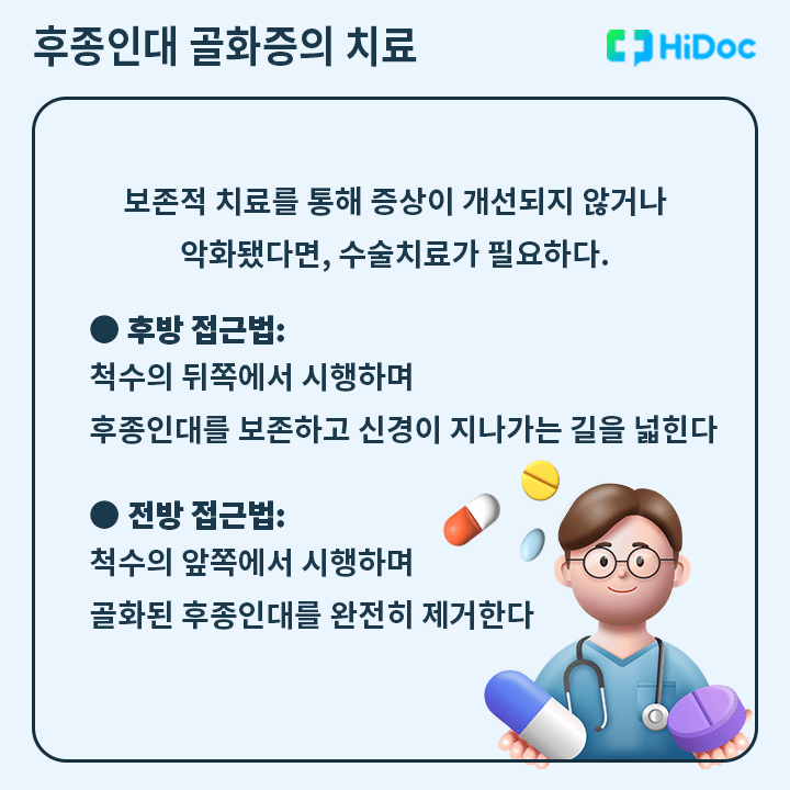 발병 초기에는 충분한 안정을 취하고 약물 치료 및 물리치료 등 보존적 치료를 통해 증상의 차도를 살핀다. 하지만 증상이 개선되지 않거나 악화된다면 수술적 치료가 필요할 수 있다.