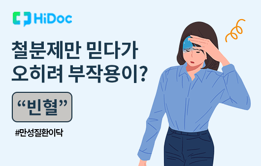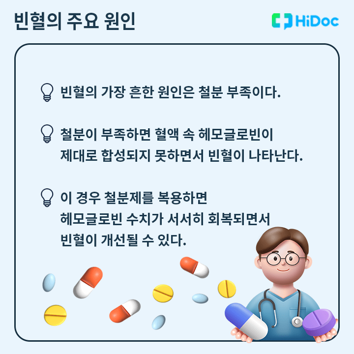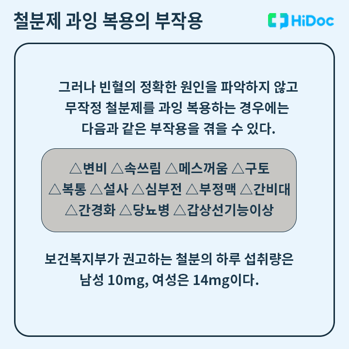 빈혈이 발생하는 가장 흔한 원인은 철분 부족이다. 이 경우 철분제를 섭취하면 혈액 속 헤모글로빈 수치가 정상으로 돌아오면서 빈혈이 완화된다. 하지만 빈혈이 나타났다고 해서 무작정 철분제를 섭취해서는 안 된다. 정확한 원인을 파악하지 않고 철분제를 과잉복용하는 경우 변비나 속 쓰림과 같은 부작용이 나타날 수 있고, 심각한 경우에는 간질환이나 당뇨병 등의 합병증이 발생할 수도 있기 때문이다.