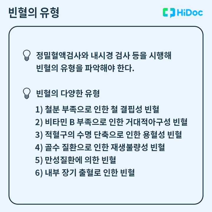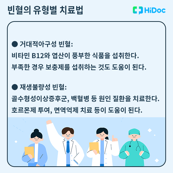 발생하는 원인에 따라 빈혈은 △거대적아구성 △재생 불량성 △용혈성 등으로 나눌 수 있다. 따라서 빈혈이 생겼다면 의료기관에 방문해 건강 상태를 확인하고, 각 유형에 맞는 적절한 치료를 시행해야 한다.