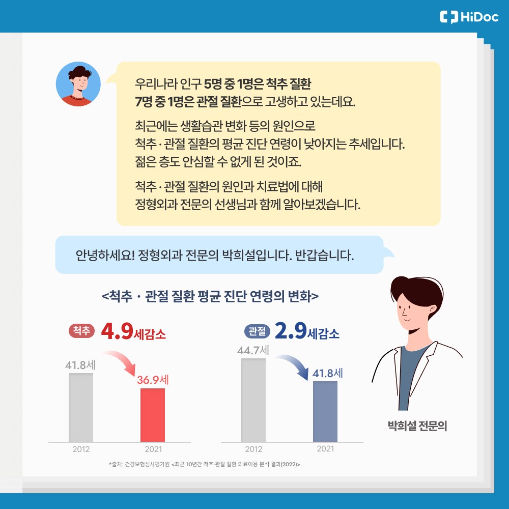 건강보험심사평가원 자료에 따르면 2021년 척추 질환자는 1,131만 명으로 전체 인구수 대비 환자 비율은 22%였으며, 2011년 대비 2.7% P 상승한 것으로 나타났다. 관절 질환자 수는 736만 명으로 전체 인구수 대비 관절 질환 환자 비율은 14.3%였다. 2011년 환자 수와 대비하면 2.1% P 상승해, 척추·관절 질환자는 꾸준히 늘고 있는 것으로 확인됐다.