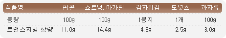 얼만큼 먹어도 좋은가? 사실 전혀 먹지 않는 것이 가장 좋은 방법이지만, 지금까지 길들여졌던 트랜스 지방의 맛을 잊을 수 없다면 허용된 범위 내에서만 먹는 것이 바람직 합니다.